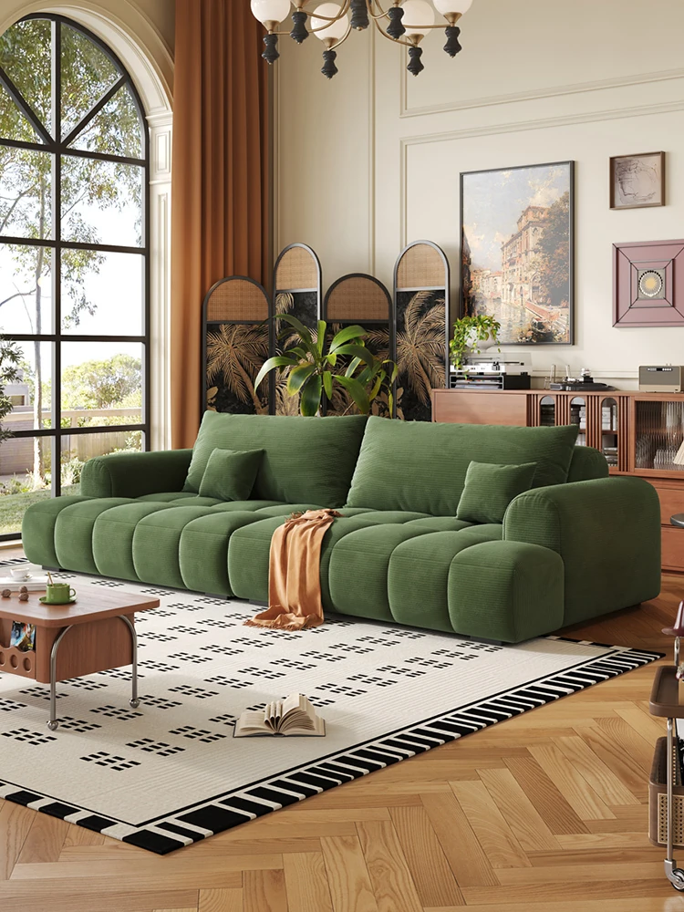 フレンチヴィンテージ風リビング用コーデュロイ大耳エレファントソファ - 現代的でシンプル、小さなお部屋にもぴったりな高背もたれのグリーンソファ。おしゃれで居心地の良い空間を演出します!
