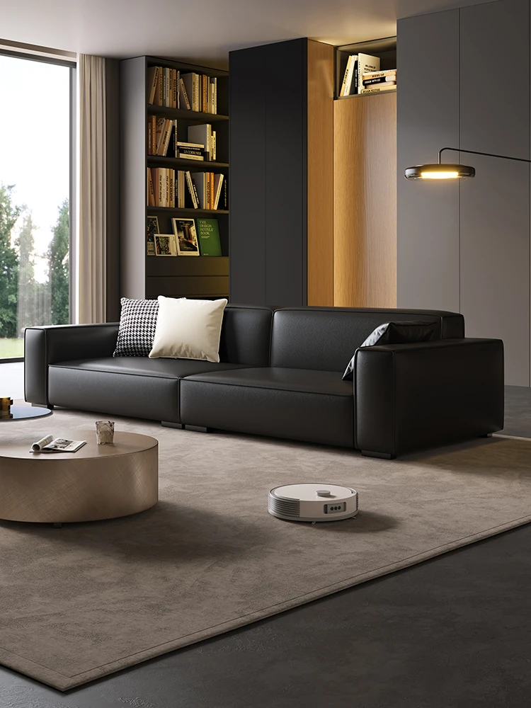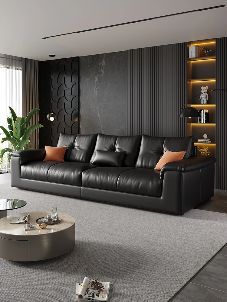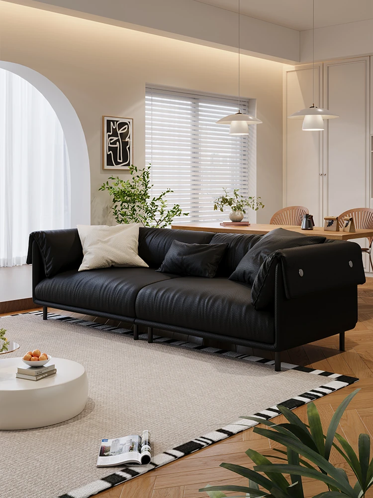 2025年新作 イタリアンミニマリズム ブラックレザー リビング用ソファ モダンでシンプルなデザイン 小型住宅に最適!快適さとスタイルを両立したラウンジソファ。