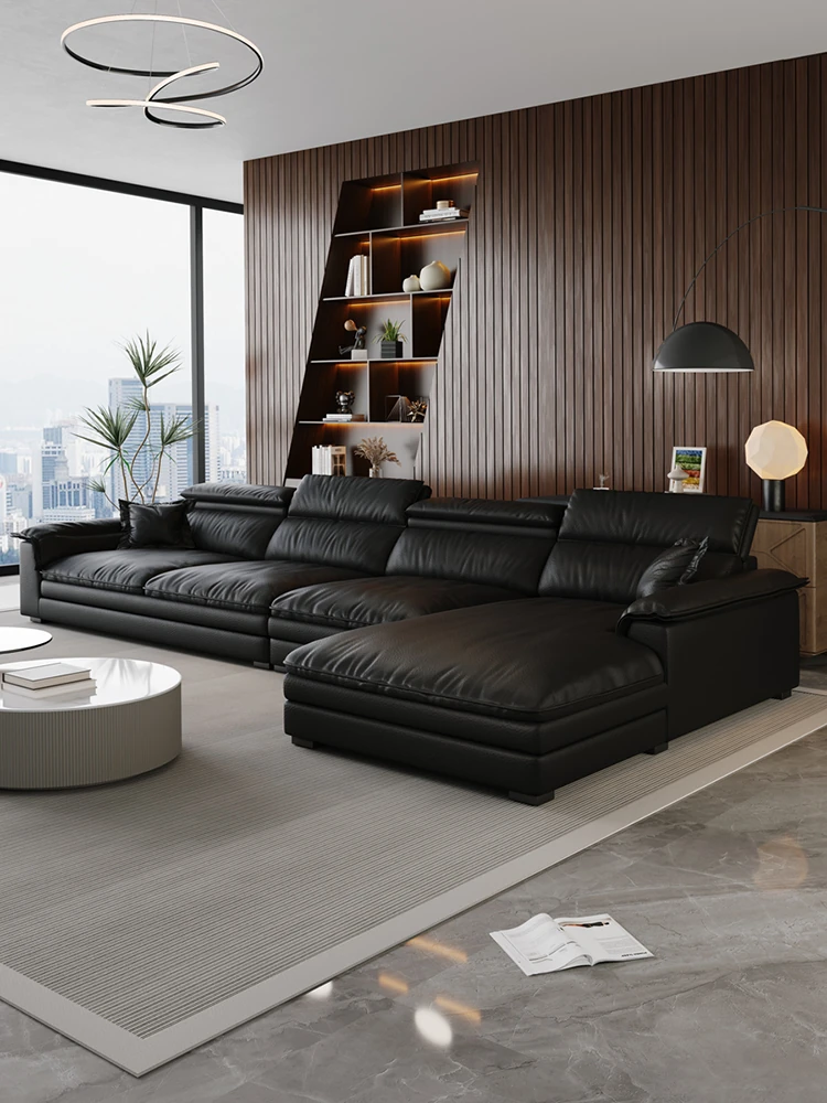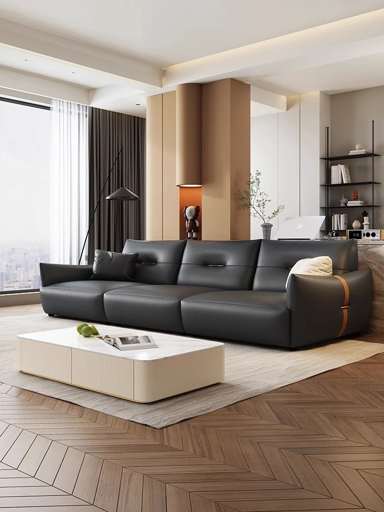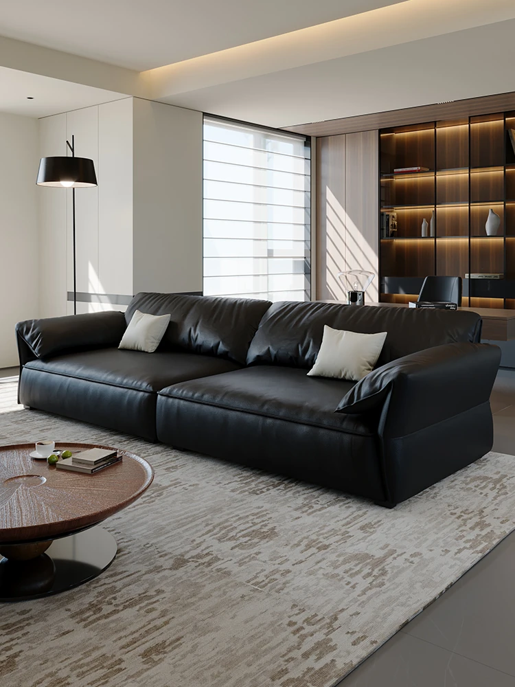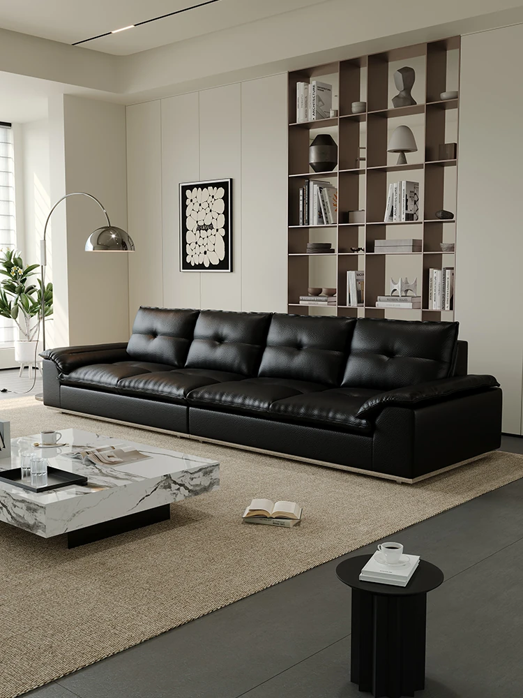 2025年新作!イタリアンミニマリズムデザインのエレファントイヤー本革ソファ - モダンラグジュアリー、ブラックダウンファブリックのストレートラインソファで、洗練されたリビング空間を演出します。