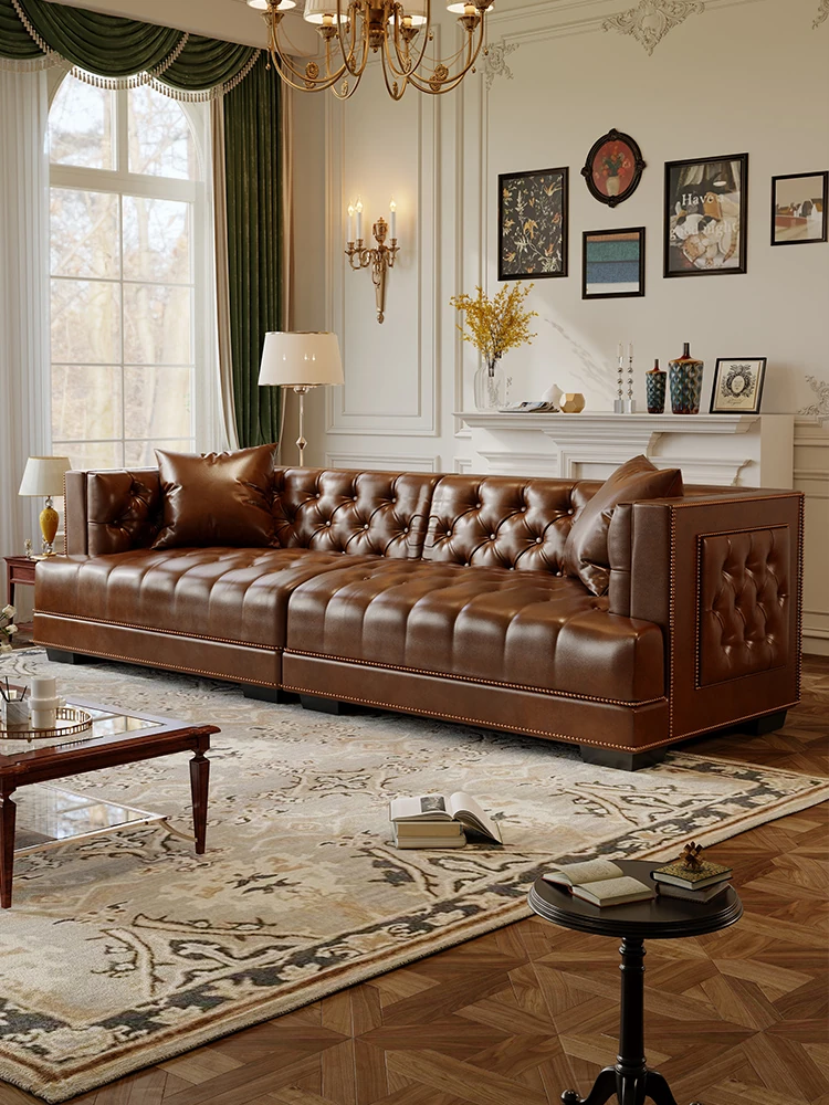 2025年新作!アメリカンビンテージデザインのオイルワックスレザー製引き手付きリビングソファ。別荘にぴったりな直線的な旧茶色レザーソファで、優雅さと温もりを演出します。お部屋の雰囲気を一新する特別な一品!