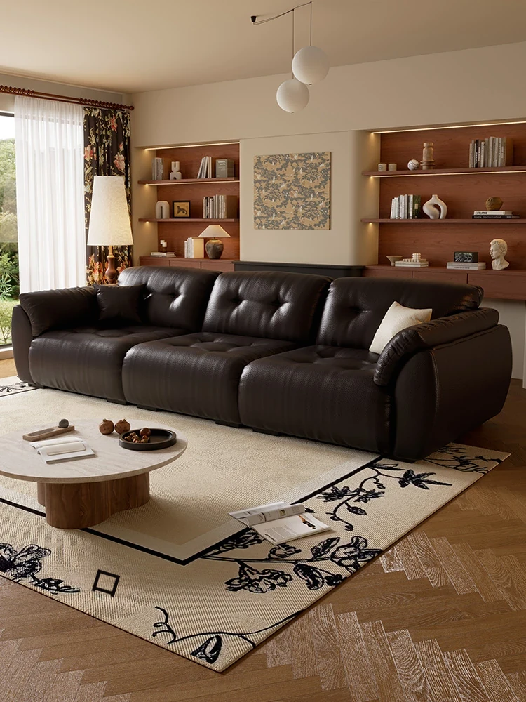 2025年新作!イタリアンミニマリズムデザインの本革ソファ。レトロな雰囲気を持つ小型リビングに最適なブラックレザーソファで、スタイリッシュなインテリアを演出します。