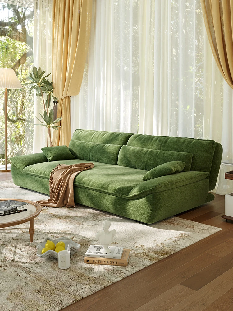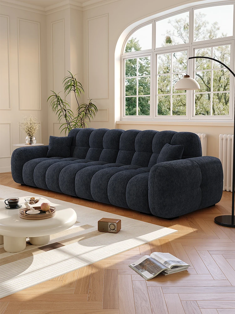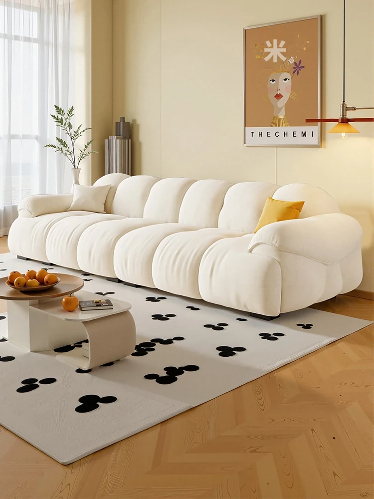 イタリアンミニマル・シェニールベルベット・ビッグクラウドソファ、リビングルームにぴったりなシンプルでクリーミーなデザイン、小さな空間でも映えるストレートソファ!快適さとスタイルを両立させた一品。