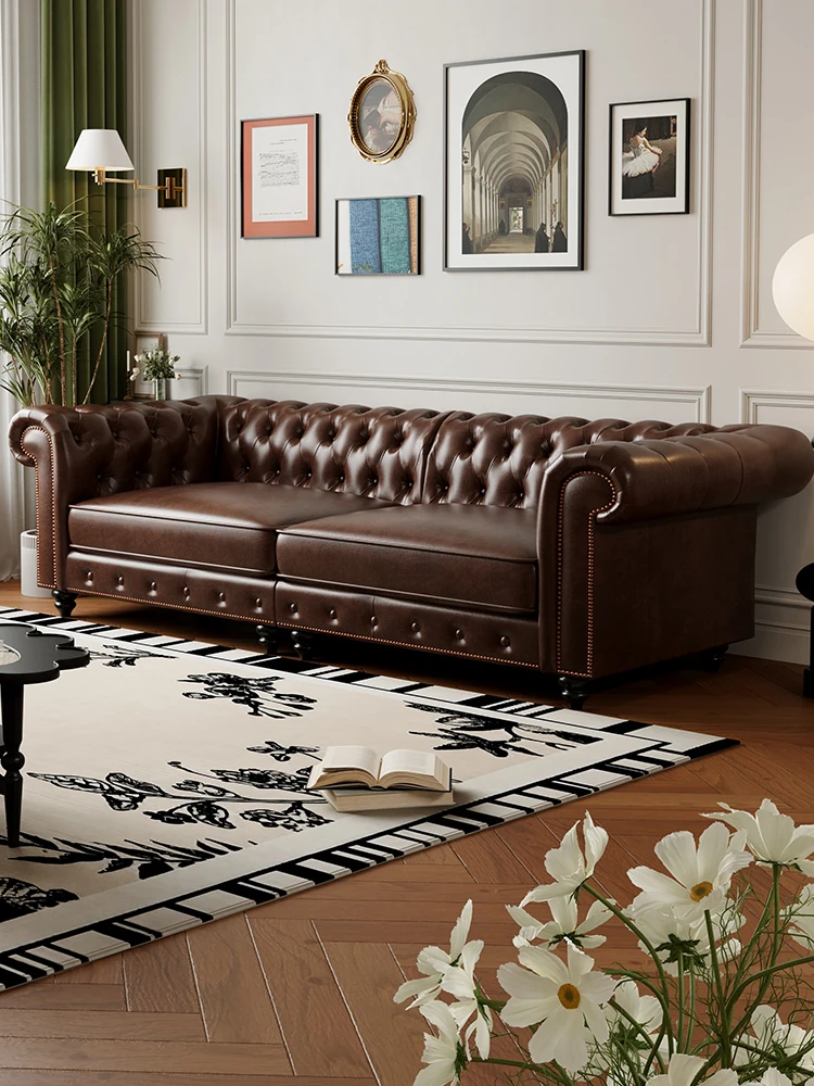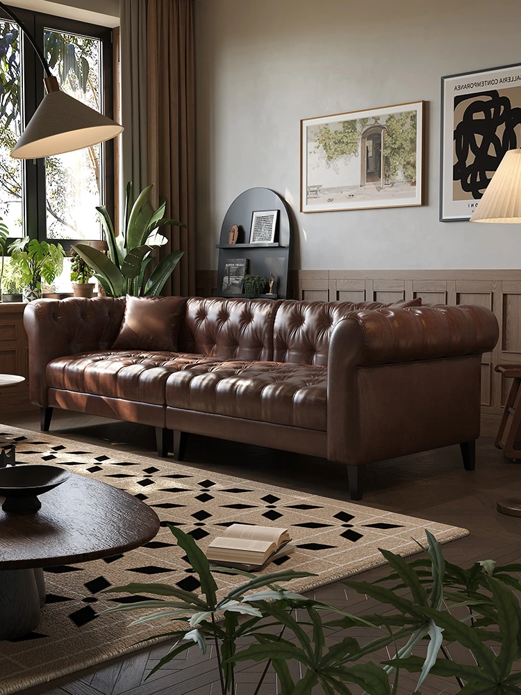 2025年新作!アメリカンヴィンテージオイルワックスレザーの引き締めソファ。欧風ライトラグジュアリー、大型リビングにもぴったりなミッドセンチュリー風ハイバックソファ。快適さとスタイルの融合をお楽しみください!