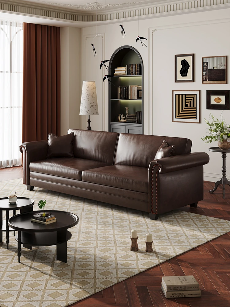 2025年新作!アメリカンレトロスタイルのオイルワックスレザー小型リビングソファ。田舎風の別荘にぴったりのバトンソファで、居心地の良い空間を演出します!