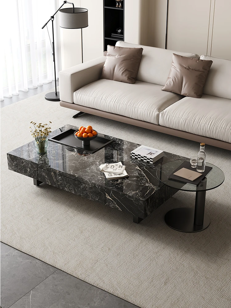 イタリアンミニマリズムデザインのオフィス用コーヒーテーブル!小型住居にもぴったりなラグジュアリーな長方形の地面に置ける岩板テーブル。洗練された美しさでリビングを彩ります!