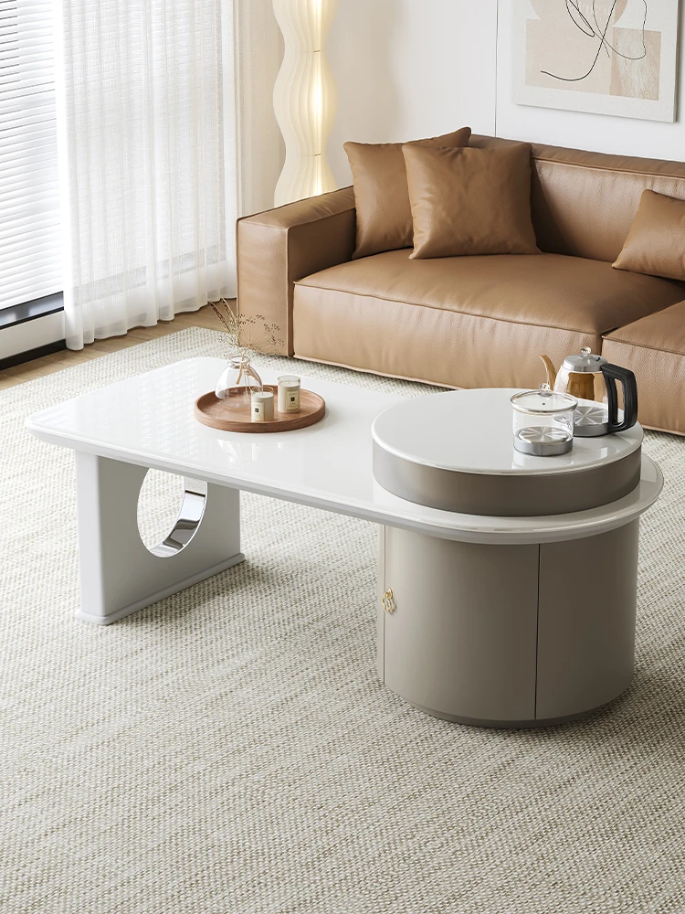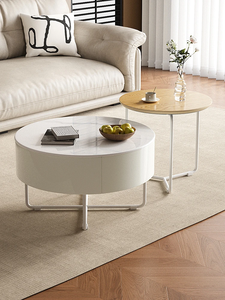 クリーム風の岩板コーヒーテーブル|現代的でシンプルなデザイン|小型から中型のリビングに最適|ラウンド型で軽やかな雰囲気|猫の爪にも優しいコンビネーションテーブル