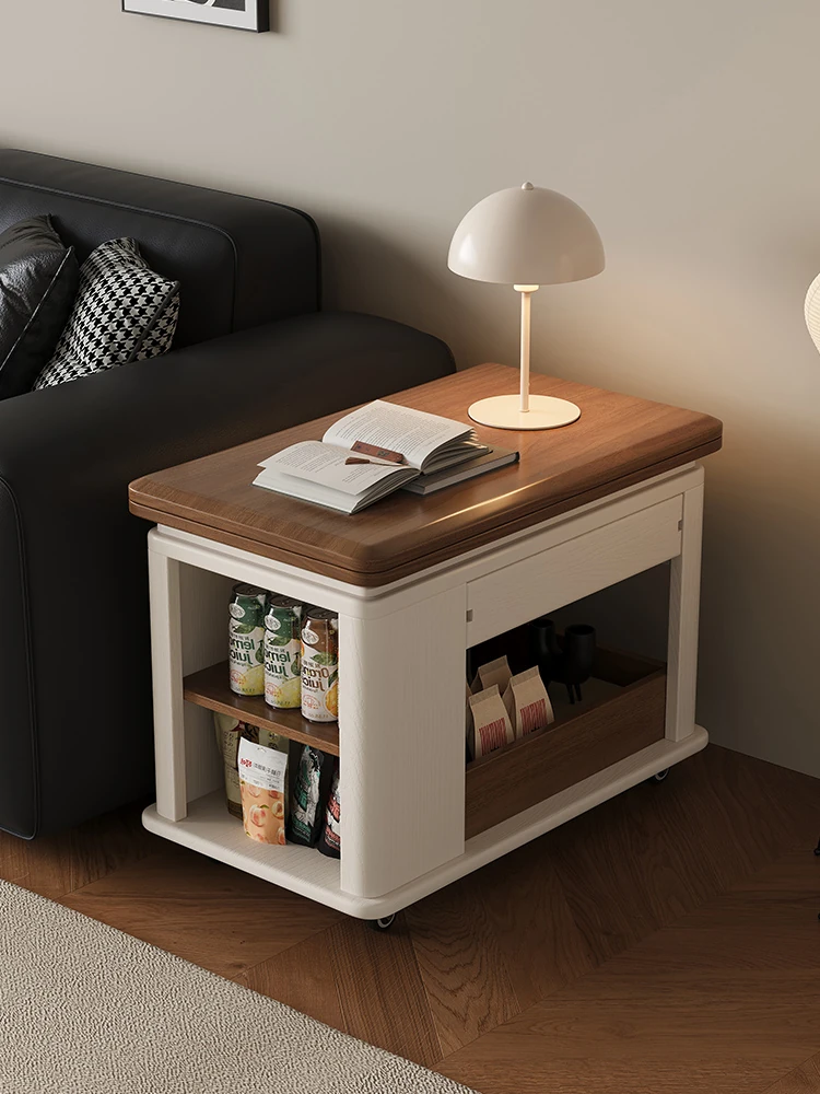 移動可能な天然木製コーヒーテーブル - モダンなリビングに最適!ソファサイドキャビネットとしても使える、小型住宅向けの伸縮式折りたたみテーブル。省スペースでおしゃれなインテリアを実現!