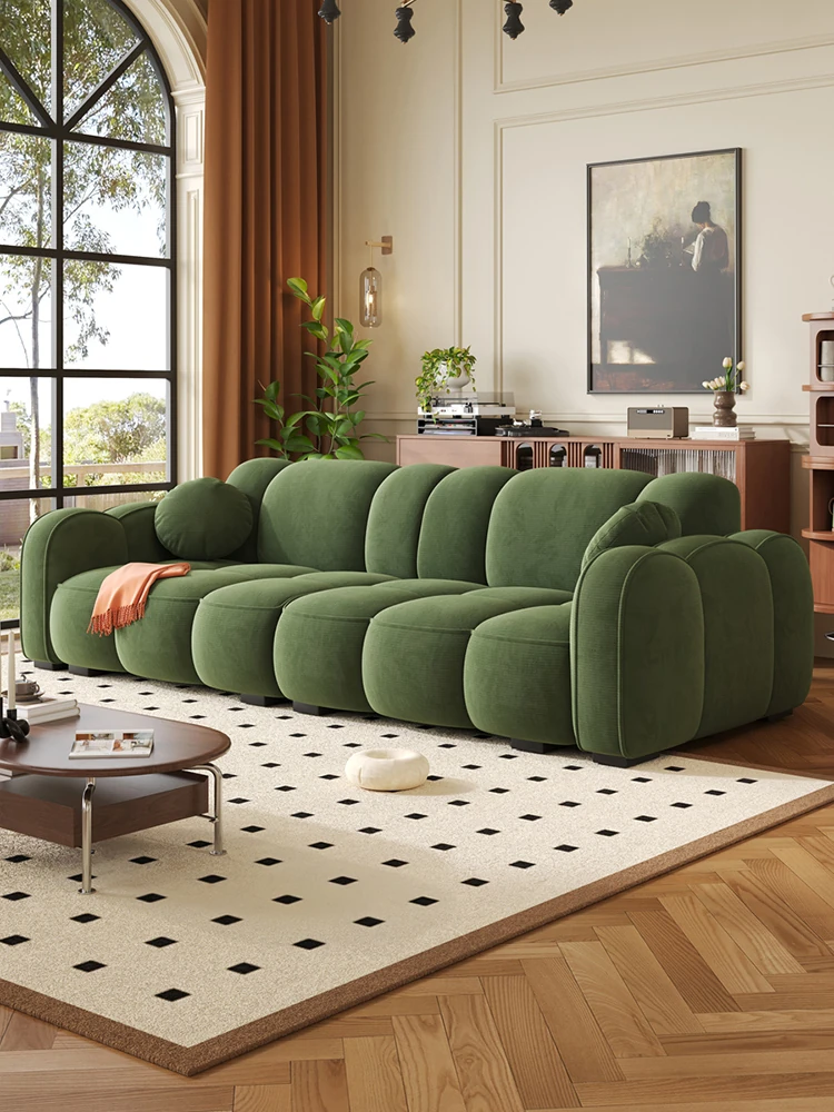 French Vintage Corduroy Sofa - Cozy Marshmallow Puff Design for Small Living Spaces - Stylish Green Biscuit Keyboard Couch
