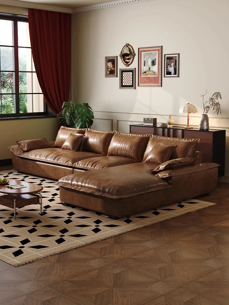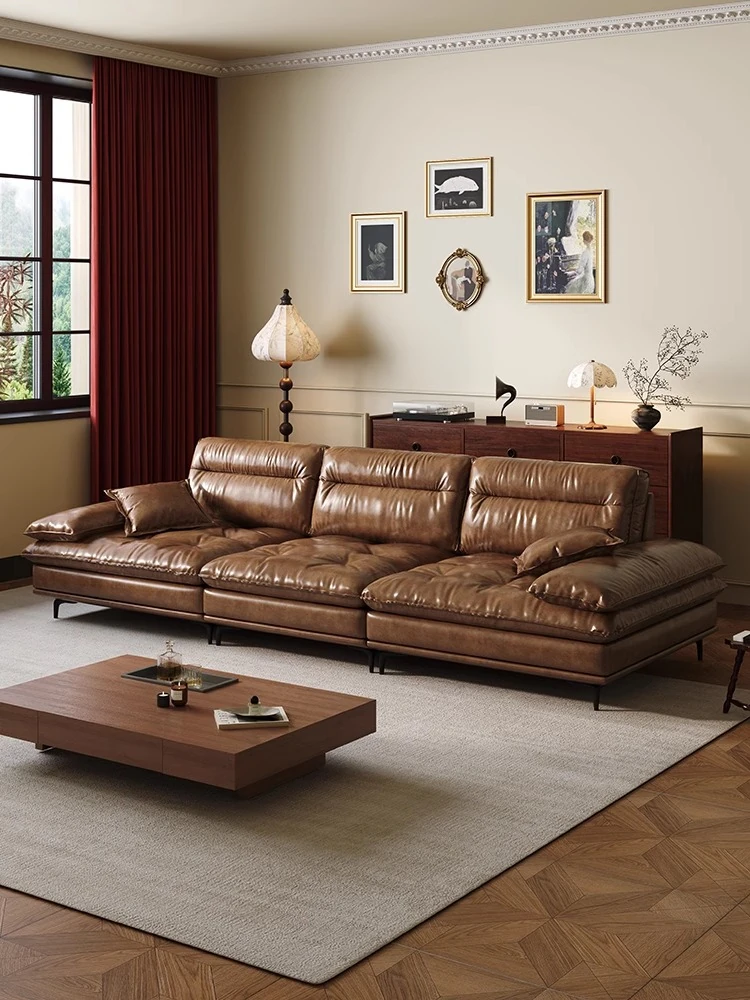 2025 New American Vintage Waxed Leather Luxury Sofa - Spacious European Style Caramel Color Pull-Down Sofa for Large Living Rooms