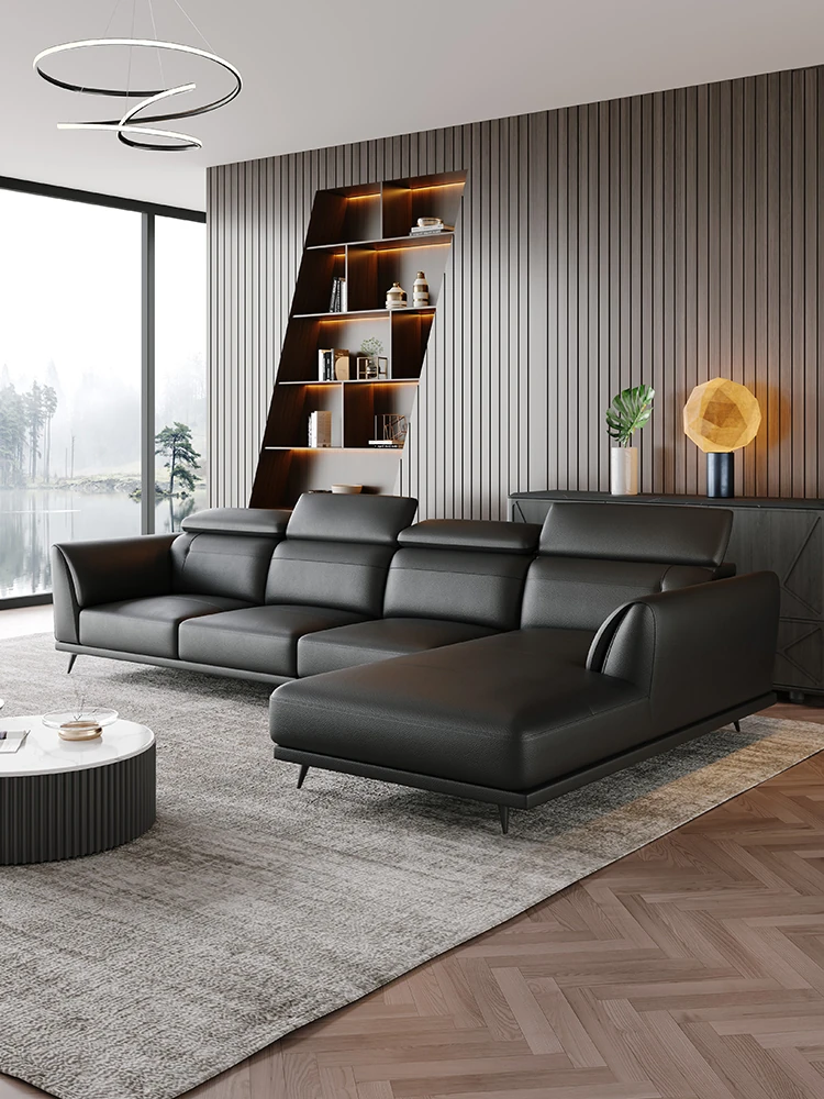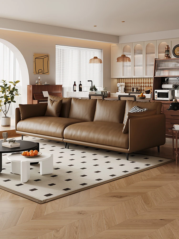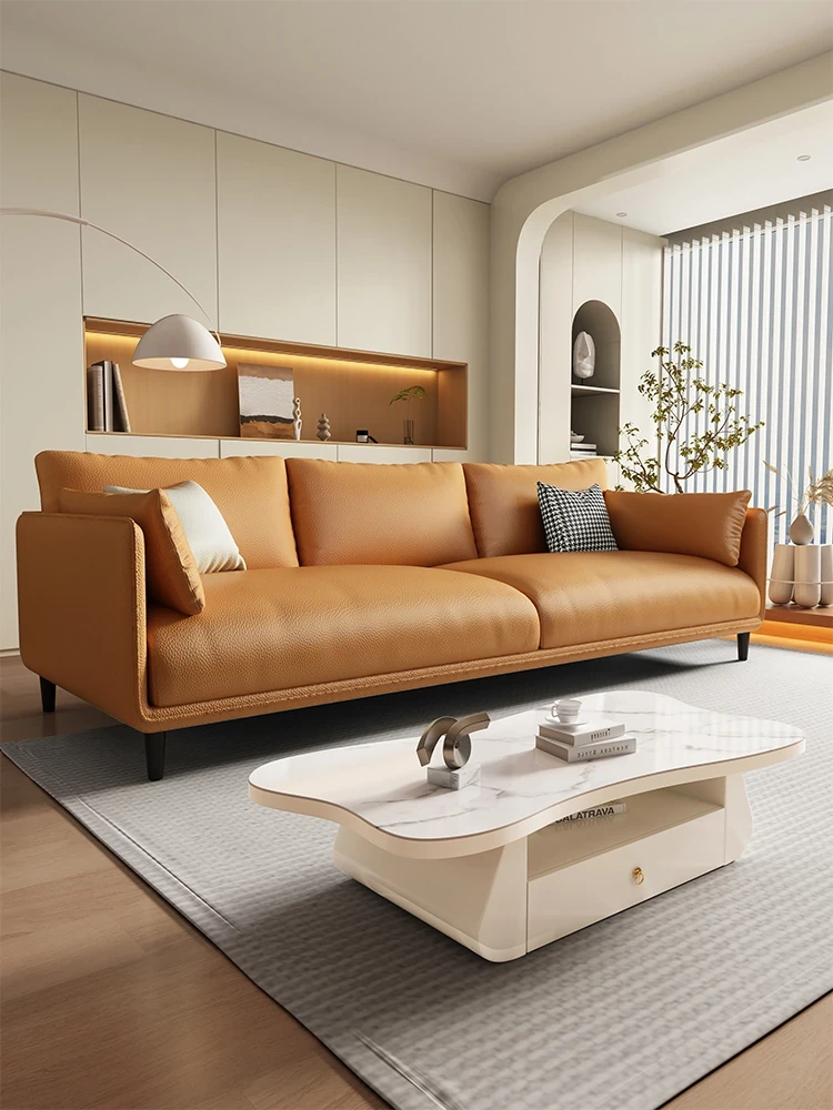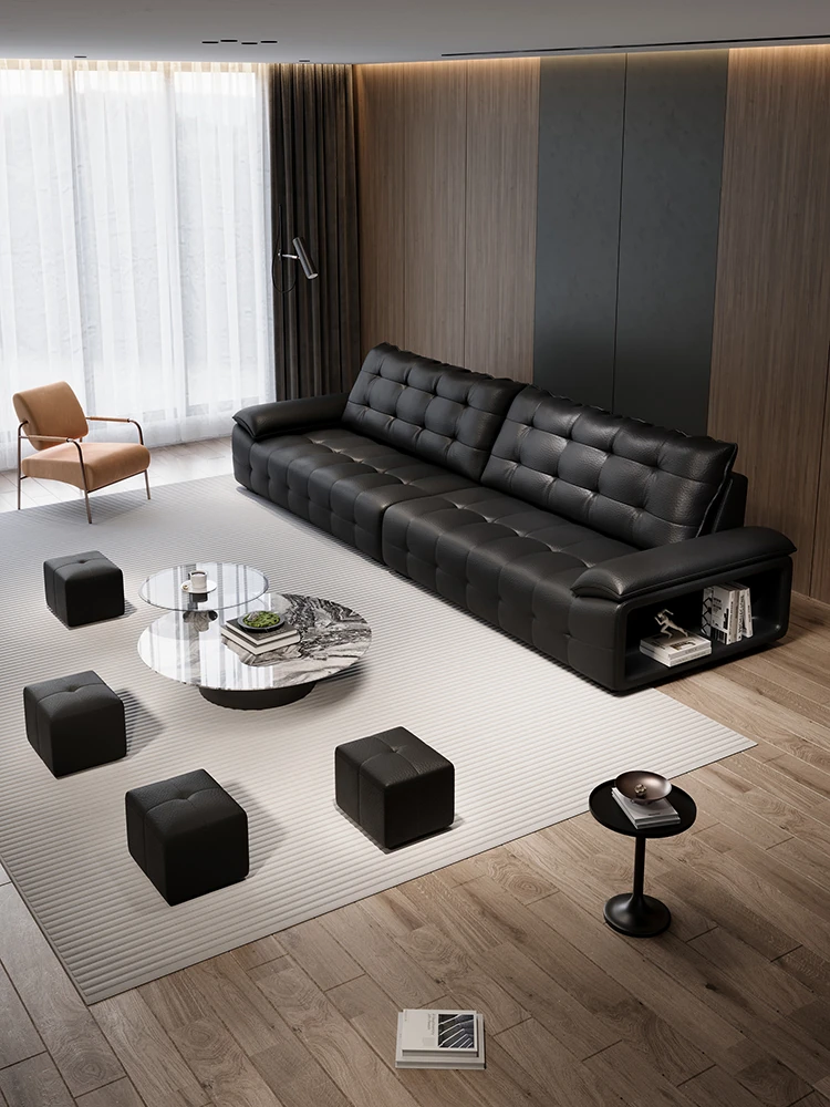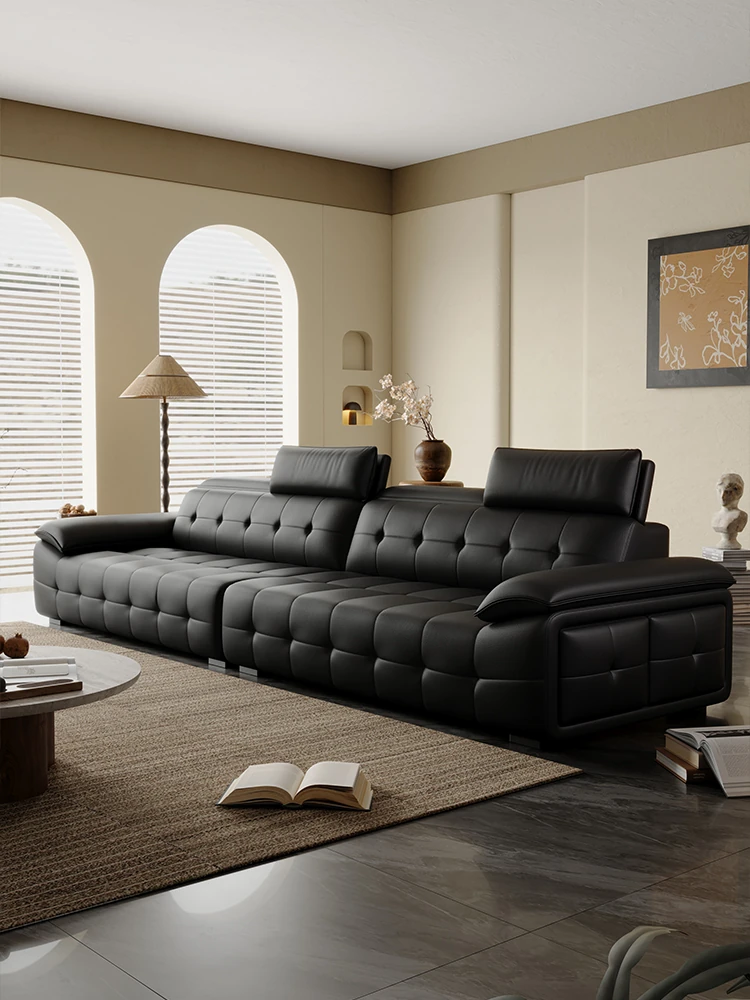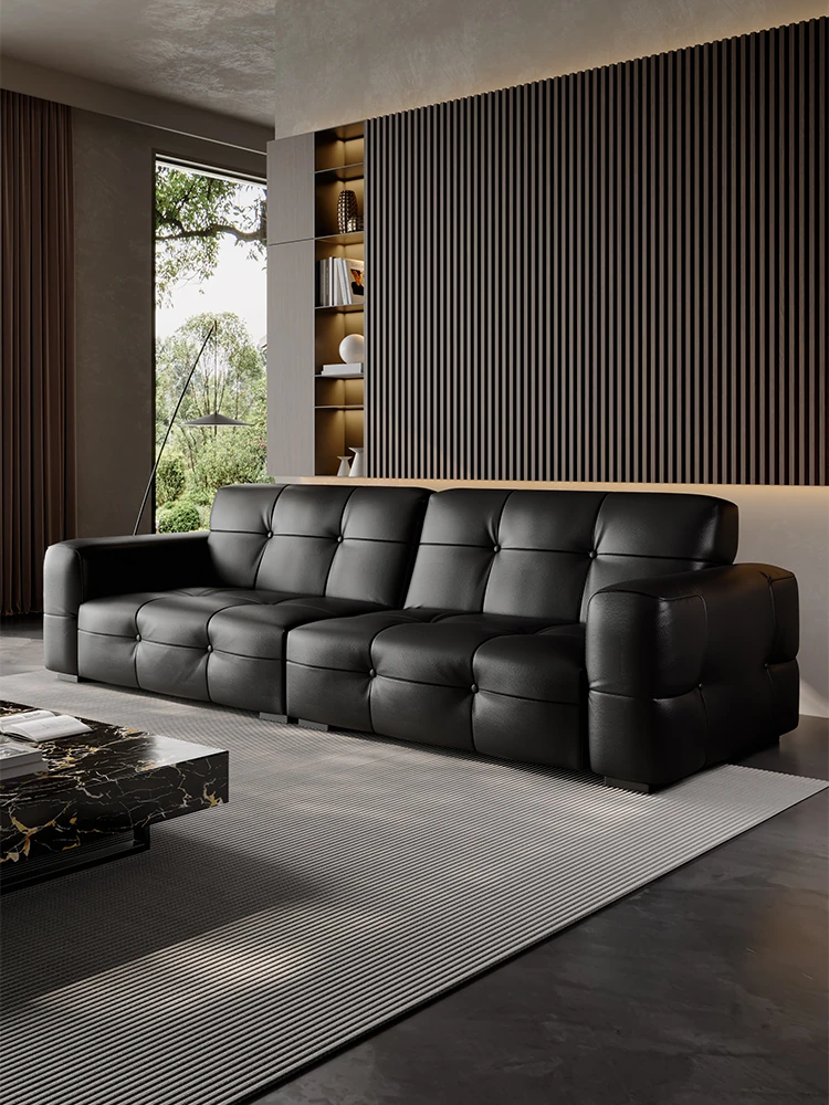 Modern Italian Minimalist Genuine Leather Sofa Set - High Back Cushion for Small Living Rooms, Chic and Luxurious Design with Straight Chaise Lounge. Perfect for Contemporary Spaces!