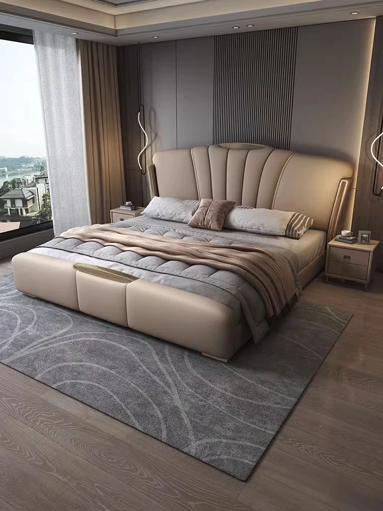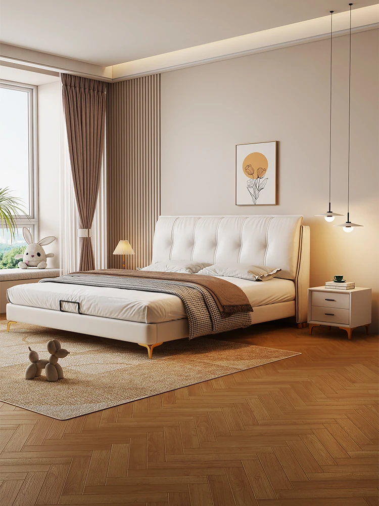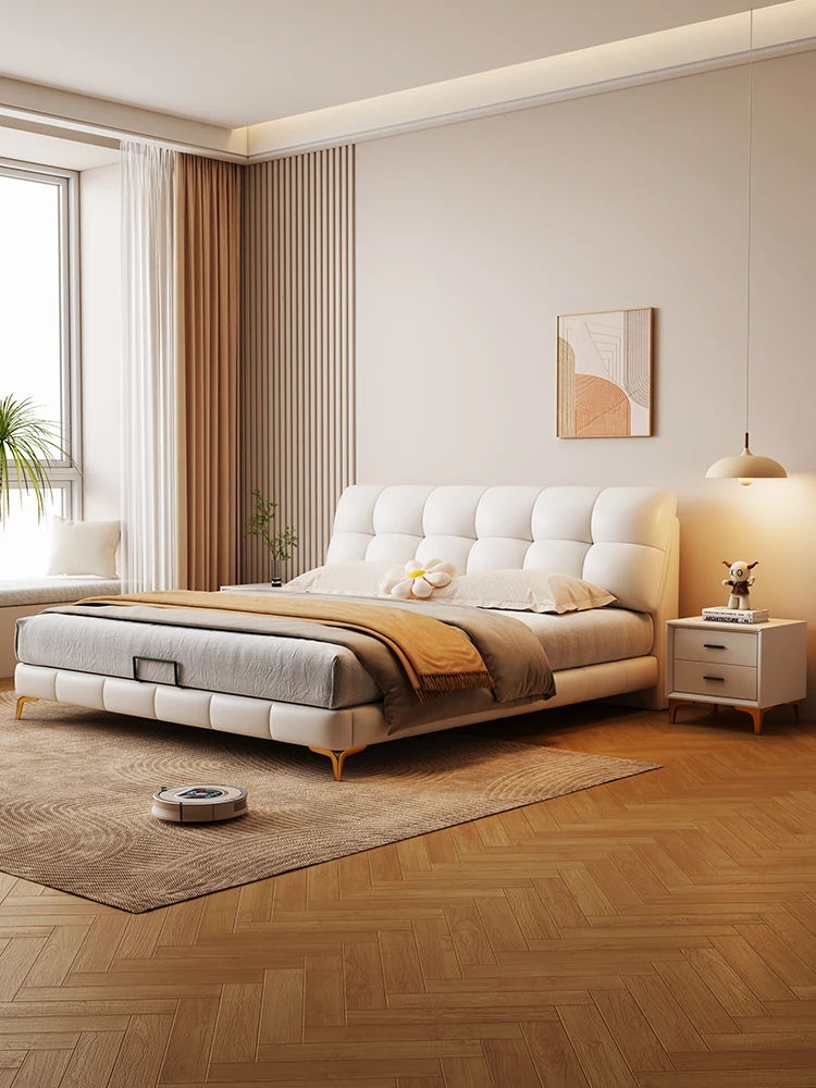 Nordic Cream Style Genuine Leather Modern Minimalist Bed - Spacious 1.8m Double Bed with Soft Headboard and Integrated Bedside Lighting, Perfect for Your Master Bedroom or Wedding Suite