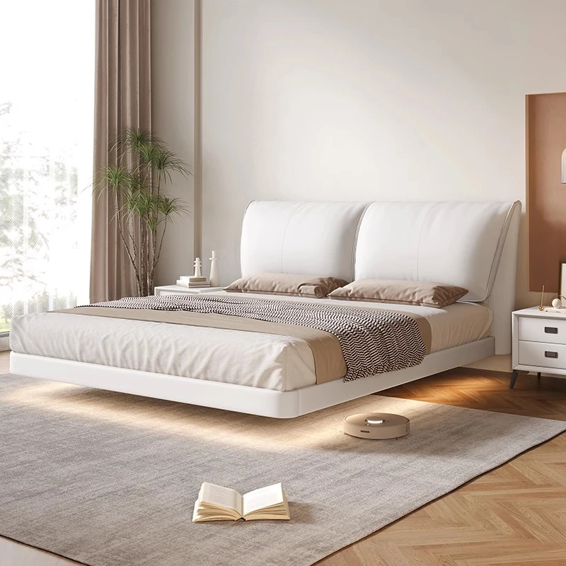 Italian Minimalist Double Floating Bed - Modern Luxury Cream Aesthetic Bedroom Bed for Trendy Master Suites