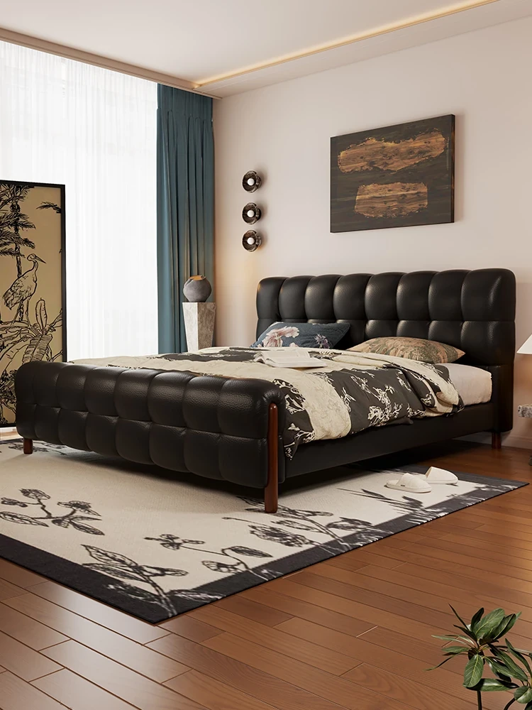 2025 New French Vintage Designer Puff Soft Bed - Luxurious Genuine Leather King Size Bed for Master and Guest Rooms, Stylish and Comfortable!