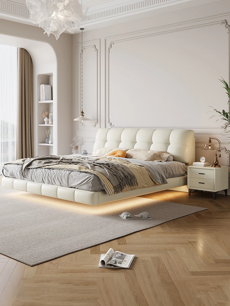 2025 French Cream Puff Floating Bed - Napa Genuine Leather Light Luxury Modern King Size Double Bed (1.8m) for Master Bedroom
