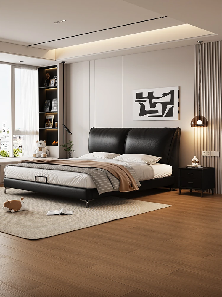 French Cream Wind Large Black Cow Floating Bed - Napa Genuine Leather Modern Luxury Double Bed for Master Bedroom, 1.8m Leather Bed