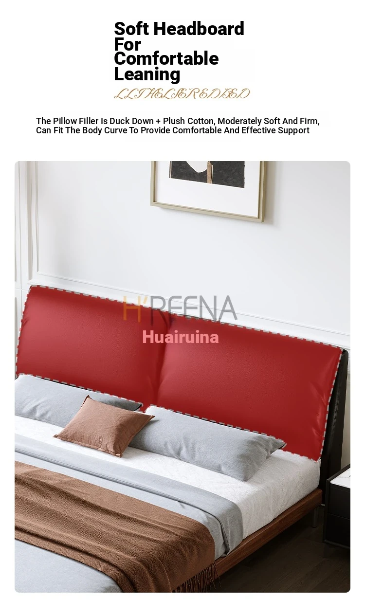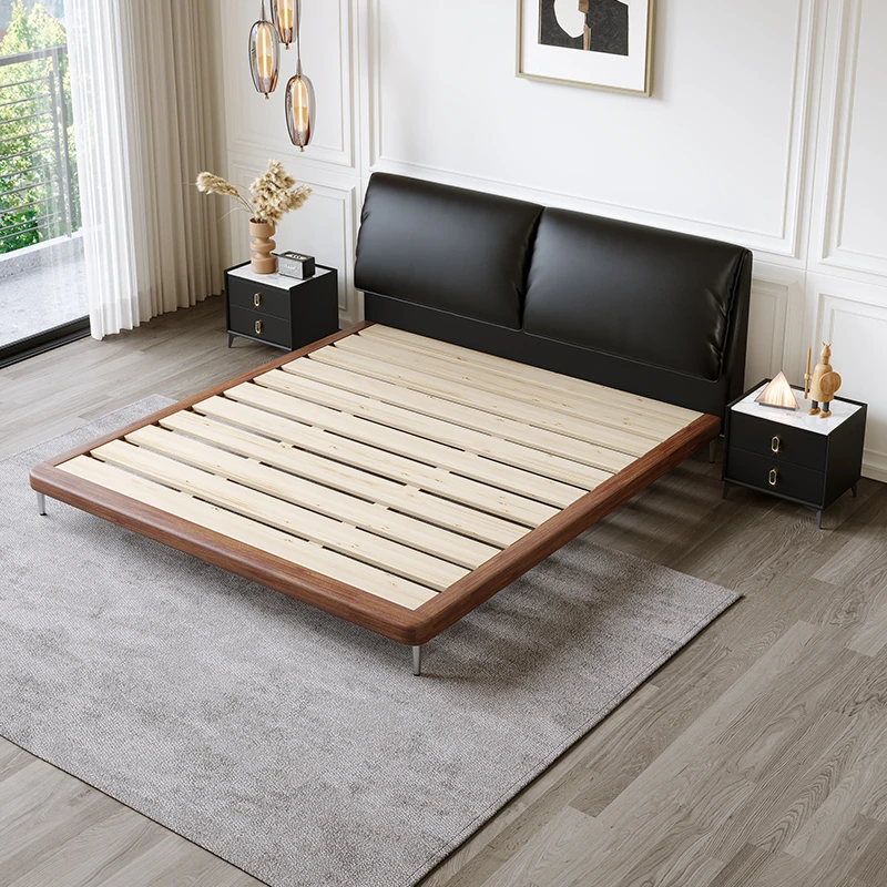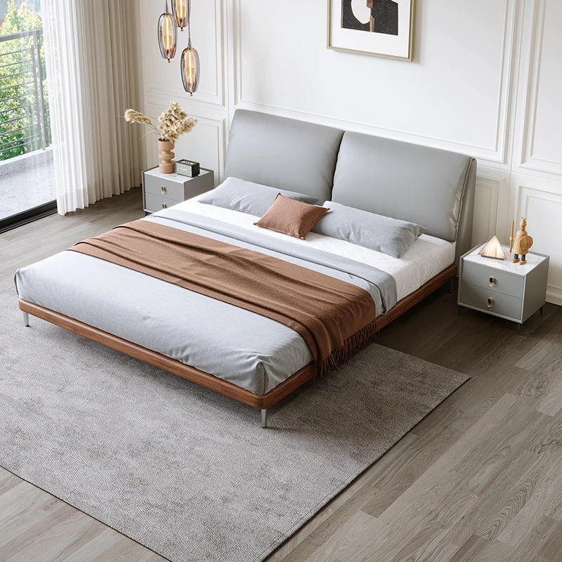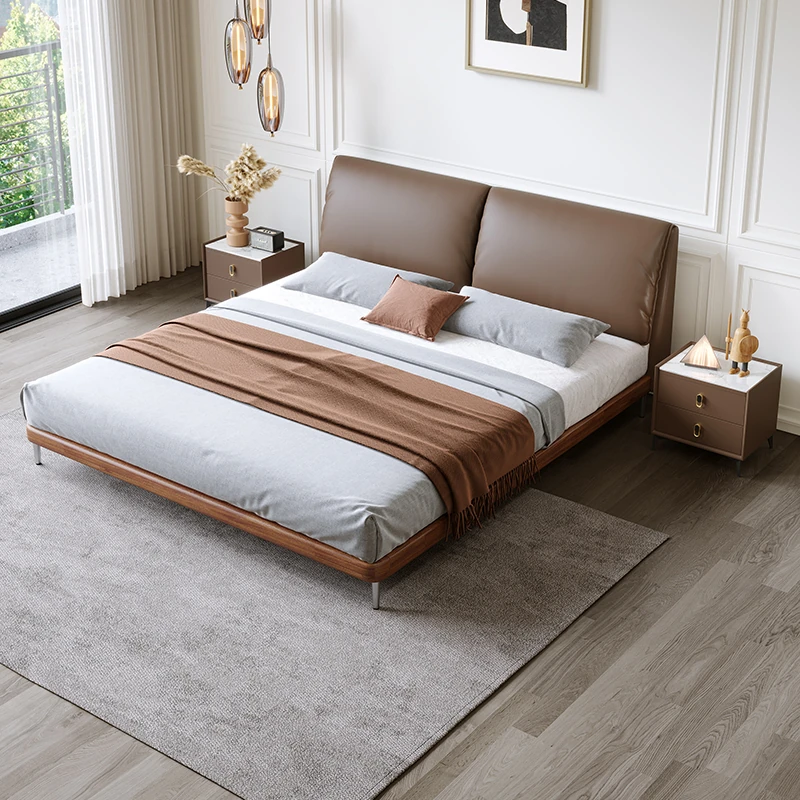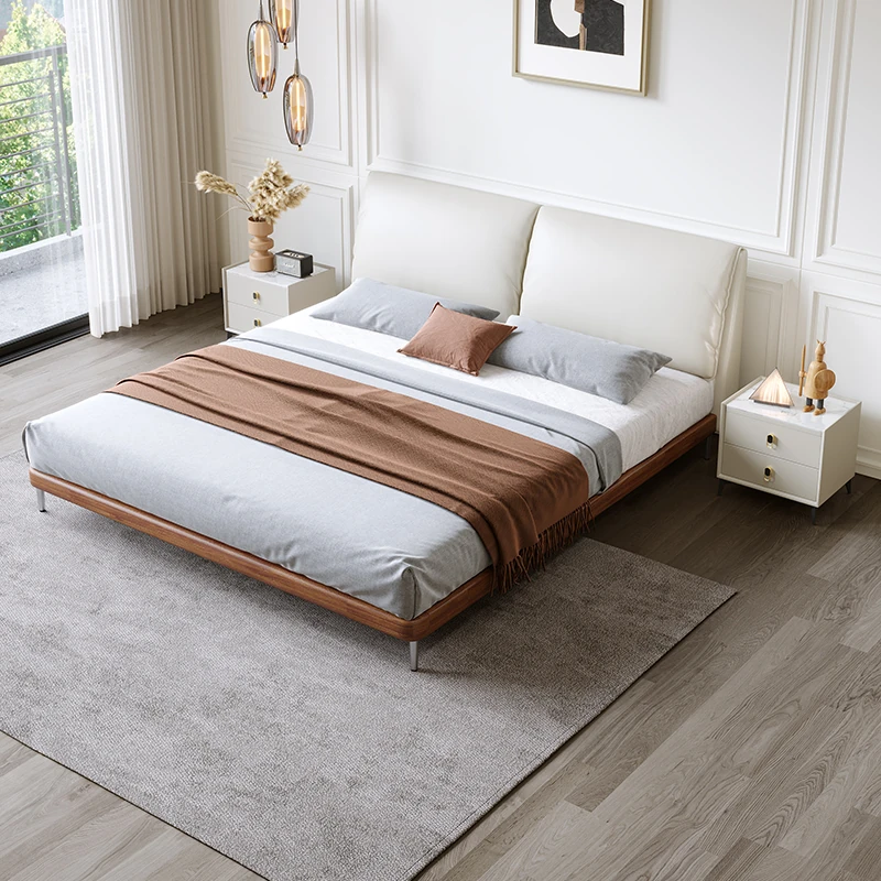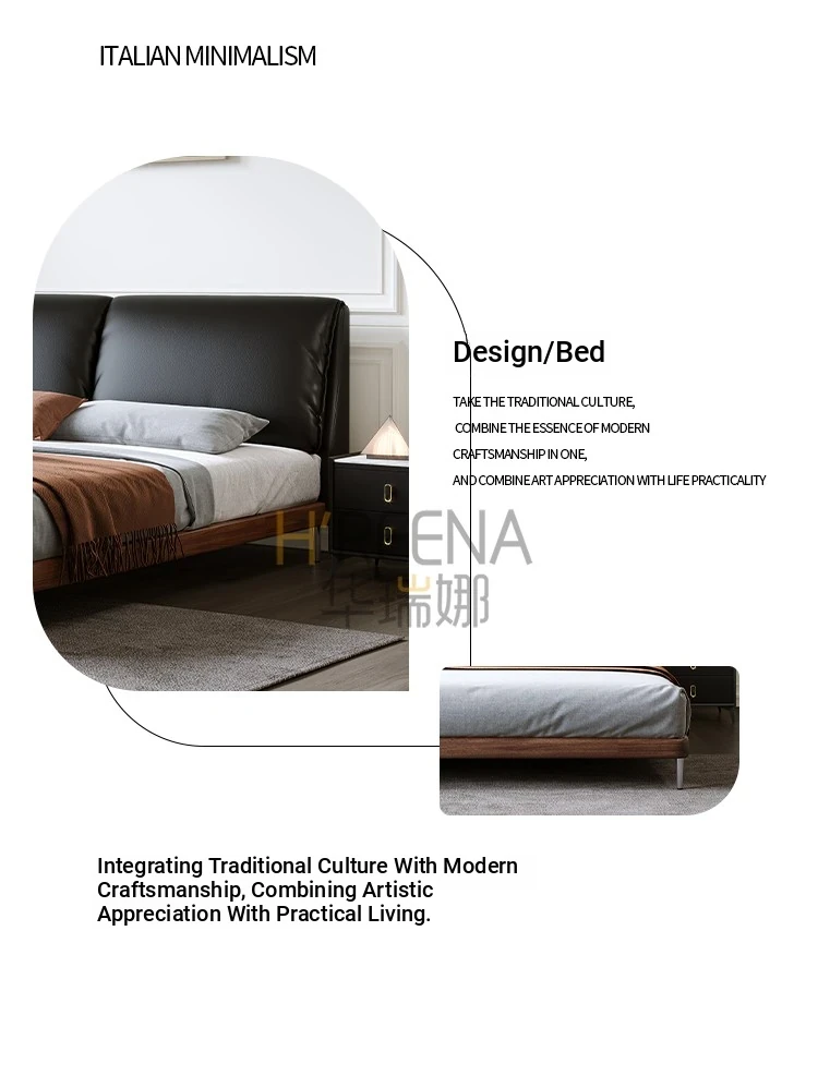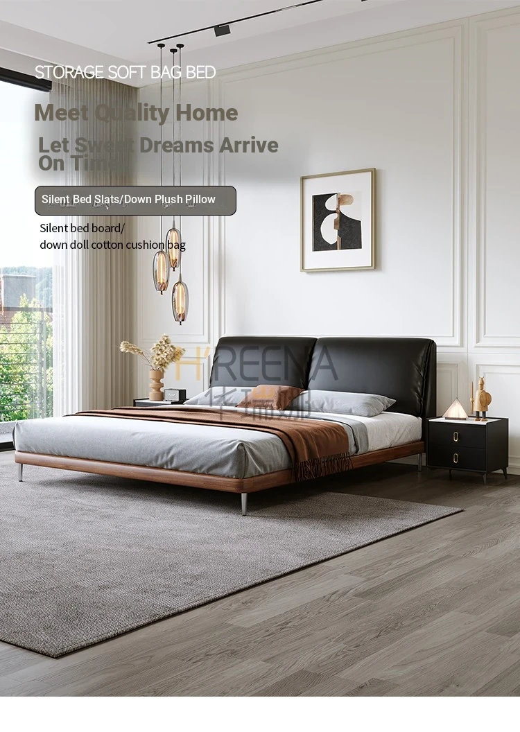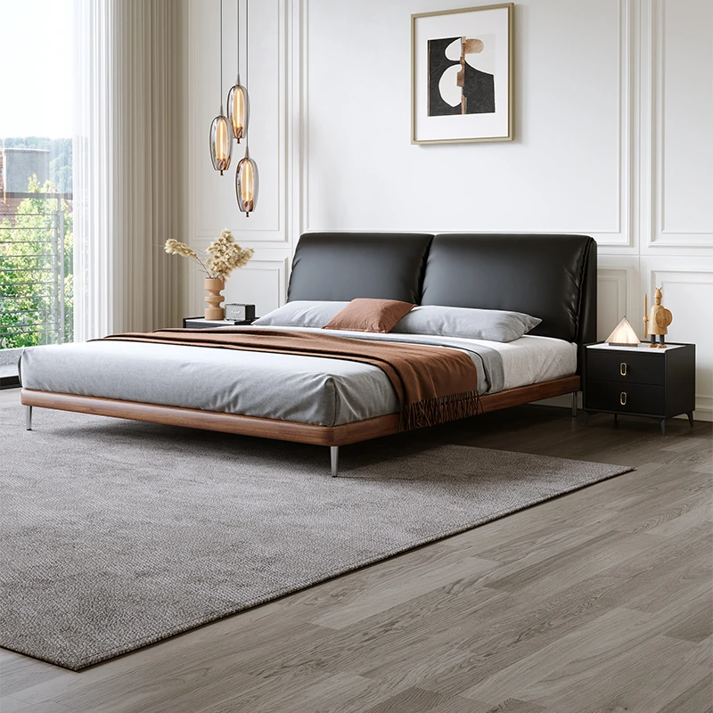 Italian Minimalist Eco-Friendly Genuine Leather Elephant Ear Soft Bed – Available in 1.5m and 1.8m Sizes, with Feather-Edged Design in Elegant Black for Master and Guest Rooms.