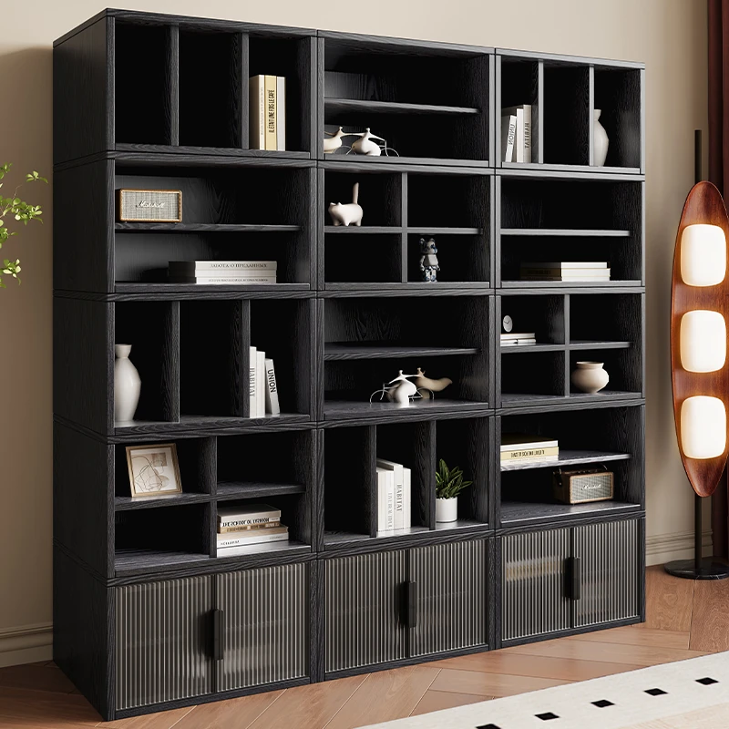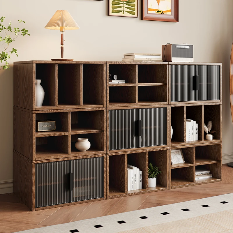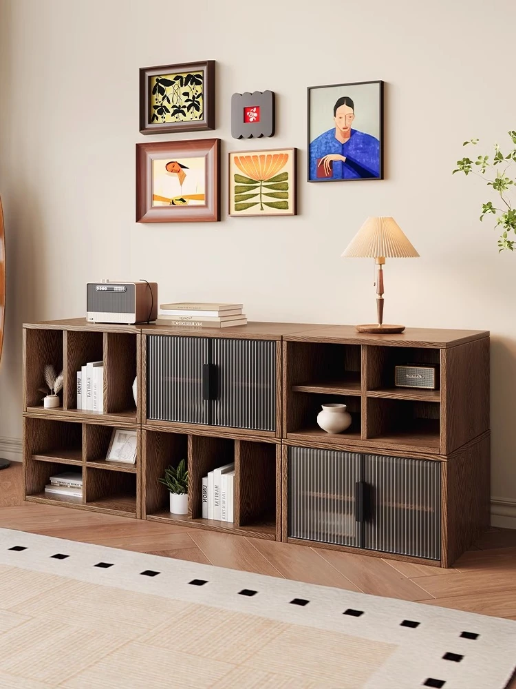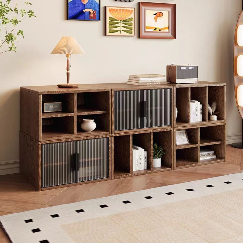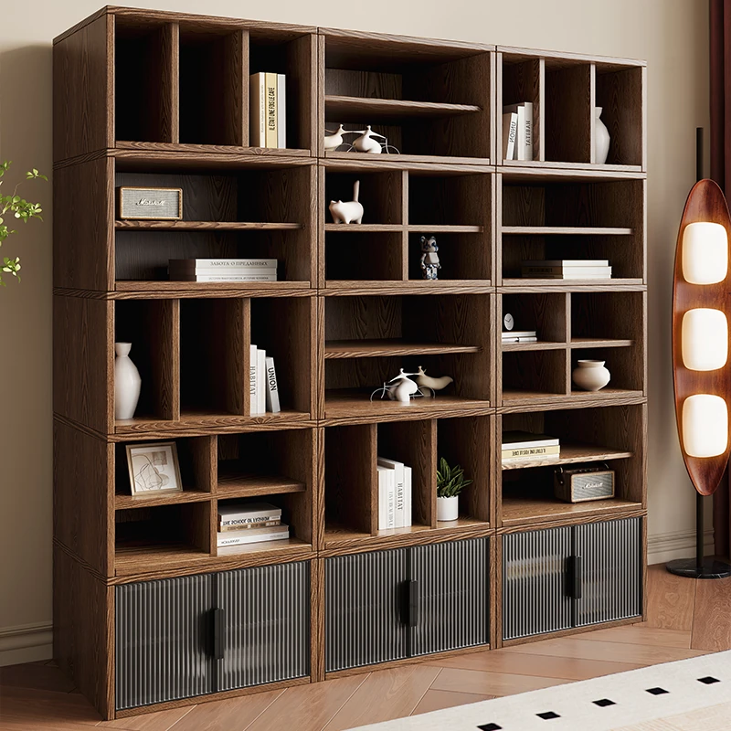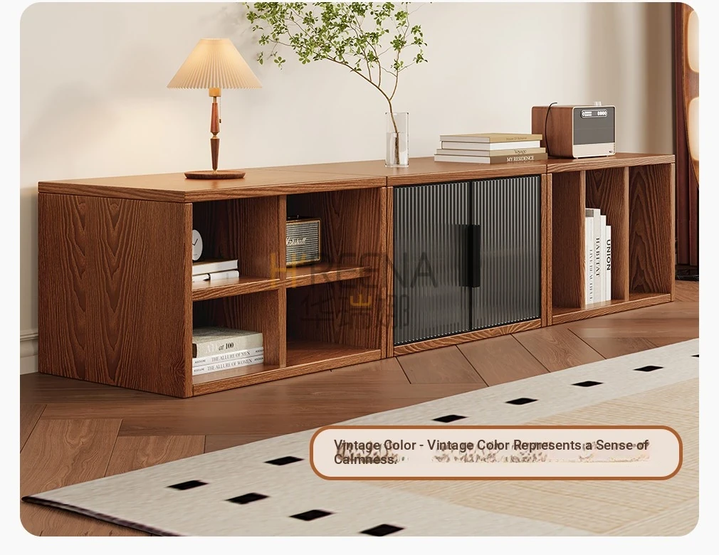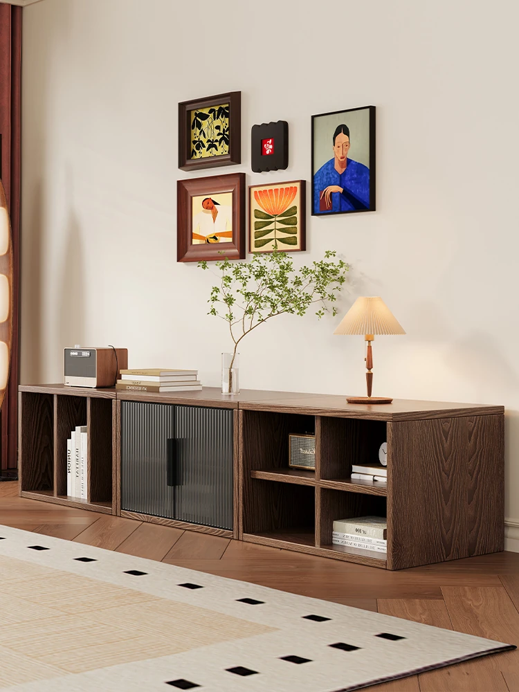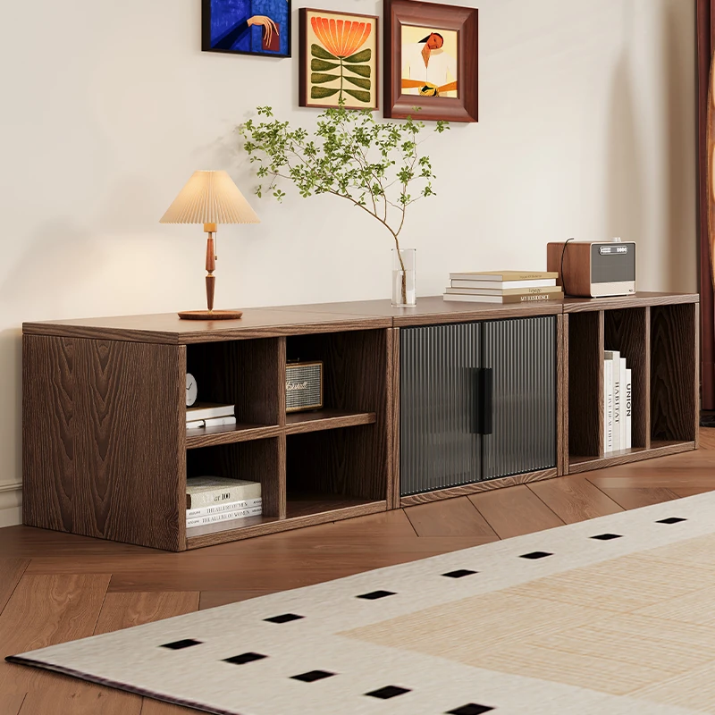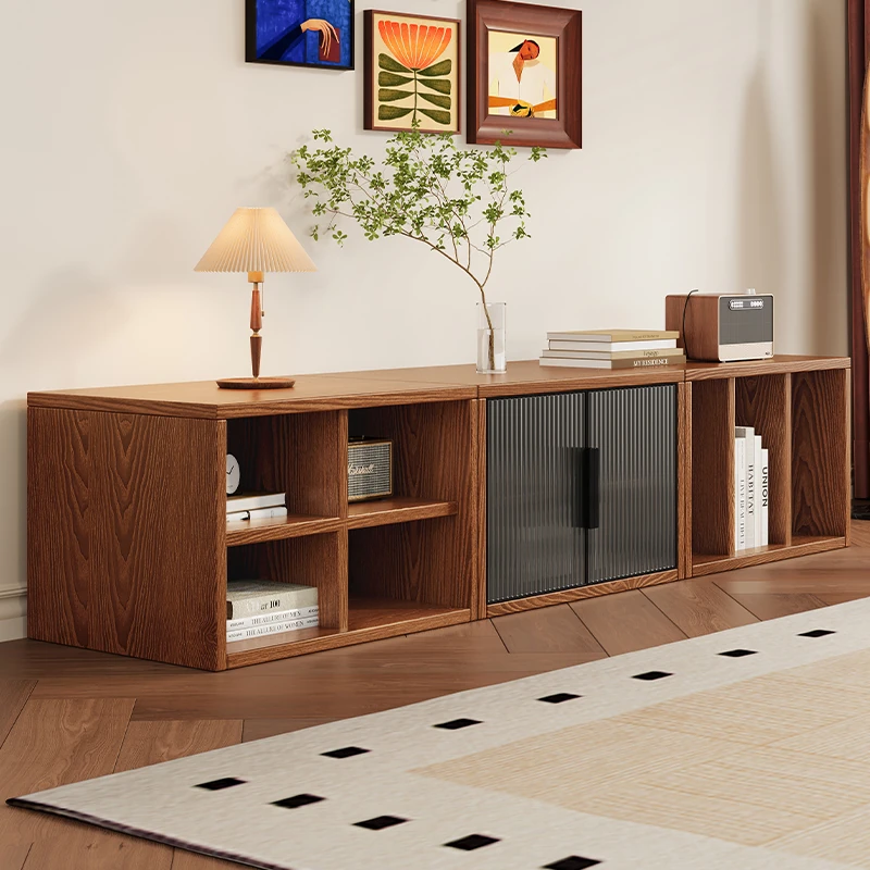 Vintage Black Walnut Modular Display Cabinet - Versatile Solid Wood Living Room TV Stand and Bookshelf with Floor-mounted Design and Stylish Card Door