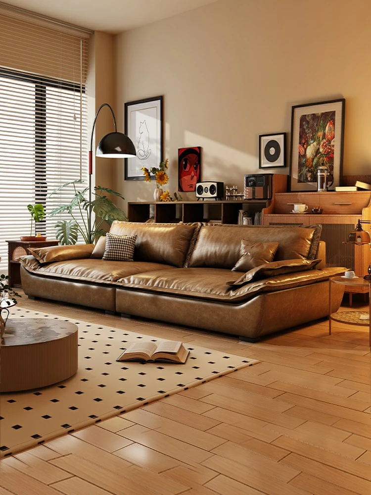 2025年新作!フランス風レトロオイルワックスレザー帆船ソファ - 小型リビングにぴったりな超広々で深い座面&高い背もたれで、快適なくつろぎ空間を実現!