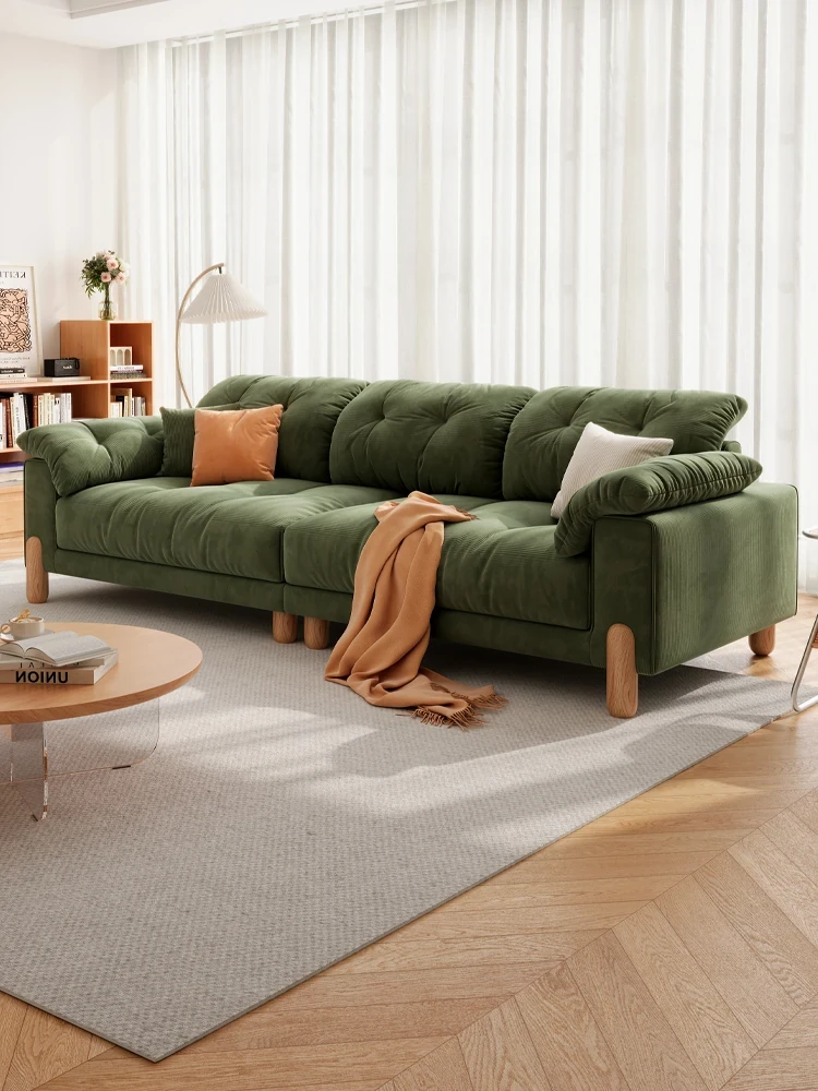 フレンチビンテージ風コーデュロイ生地のプフソファー モダンミニマリストデザイン リビングに最適なグリーンソファ 小さなお部屋にもぴったり!